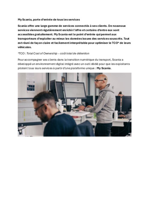 Scania offre une large gamme de services connectés à ses clients. De nouveaux services viennent régulièrement enrichir l’offre et certains d’entre eux sont accessibles gratuitement. My Scania est le point d’entrée qui permet aux transporteurs d’exploiter au mieux les données issues des services souscrits. Tout est réuni de façon claire et facilement interprétable pour optimiser le TCO* de leurs véhicules.