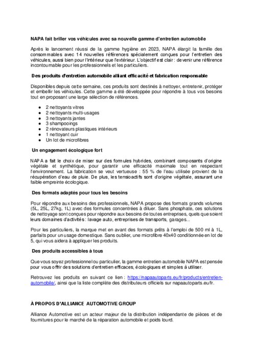 Distributeurs 09 septembre 2024 - 14:25 Après le lancement réussi de la gamme hygiène en 2023, NAPA élargit la famille des consommables avec 14 nouvelles références spécialement conçues pour l’entretien des véhicules, aussi bien pour l'intérieur que l'extérieur. PDF (97 Ko) Télécharger Crédits : Napa