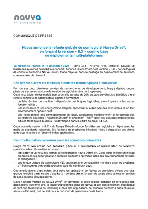 NAVYA, un leader des systèmes de mobilité autonome, annonce le lancement de la version « 6.X » de son logiciel de conduite autonome Navya Drive, étape majeure dans le passage au déploiement de solutions commerciales de niveau 4.