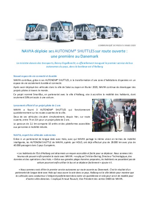 NAVYA contribue, grâce à ses AUTONOM SHUTTLES, à la transformation d'une zone d'habitations dispersées en un espace de vie socialement durable et connecté. Après avoir déployé des véhicules dans la ville de Sakai au Japon en février 2020, NAVYA continue de développer des projets pilotes à travers le monde. Ce projet nommé SmartBus, en partenariat avec la ville d'Aalborg, vise à accroître la mobilité des habitants, dont seulement 50% ont accès à une voiture.