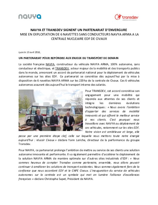 La société française NAVYA, constructeur du véhicule NAVYA ARMA, 100% autonome, sans conducteur et électrique, et TRANSDEV, acteur majeur de la mobilité et des transports publics dans le monde, annoncent un accord de partenariat national pour le déploiement de véhicules autonomes sur les sites EDF. Ce partenariat se concrétise dès mercredi 13 avril 2016 par la mise à disposition de 6 navettes NAVYA ARMA sur les 220ha de la centrale de Civaux.