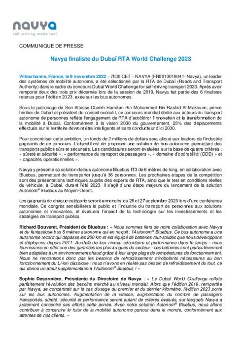 Navya, un leader des systèmes de mobilité autonome, a été sélectionné par la RTA de Dubaï (Roads and Transport Authority) dans le cadre du concours Dubaï World Challenge for self-driving transport 2023. Après avoir remporté deux des trois prix décernés lors de la session de 2019, Navya fait partie des 6 finalistes retenus pour l’édition 2023, axée sur les bus autonomes.