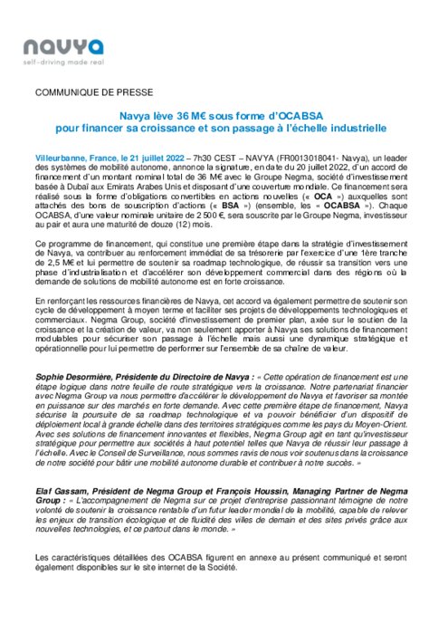 NAVYA, un leader des systèmes de mobilité autonome, annonce la signature, en date du 20 juillet 2022, d’un accord de financement d’un montant nominal total de 36 M€ avec le Groupe Negma, société d’investissement basée à Dubaï aux Emirats Arabes Unis et disposant d’une couverture mondiale. Ce financement sera réalisé sous la forme d’obligations convertibles en actions nouvelles (« OCA ») auxquelles sont attachés des bons de souscription d’actions.