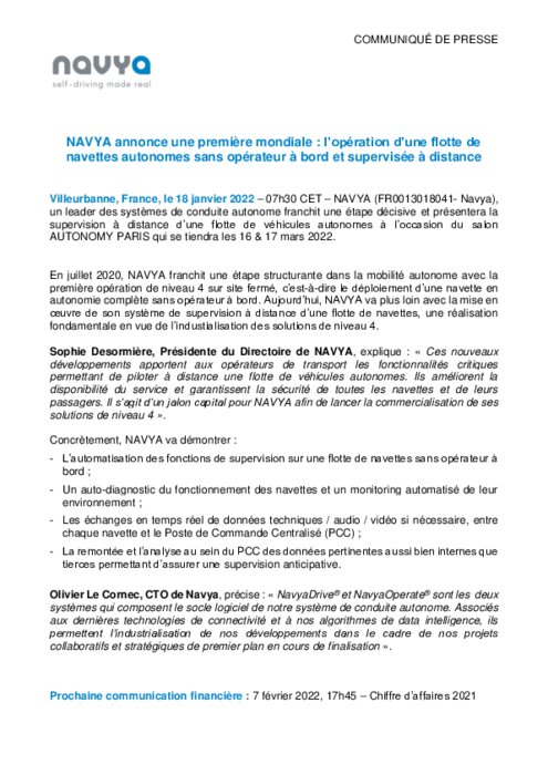 Constructeurs 18 janvier 2022 - 08:16 NAVYA , un leader des systèmes de conduite autonome franchit une étape décisive et présentera la supervision à distance d’une flotte de véhicules autonomes à l’occasion du salon AUTONOMY PARIS qui se tiendra les 16 & 17 mars 2022. PDF (305 Ko) Télécharger