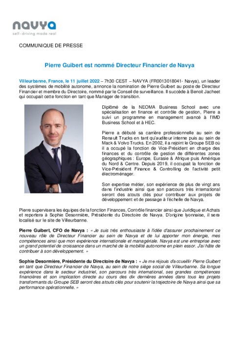 NAVYA, un leader des systèmes de mobilité autonome, annonce la nomination de Pierre Guibert au poste de Directeur Financier et membre du Directoire, nommé par le Conseil de surveillance. Il succède à Benoit Jacheet qui occupait cette fonction en tant que Manager de transition.