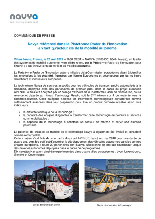 NAVYA, un leader des systèmes de mobilité autonome, vient d’être retenu par la Plateforme Radar de l’Innovation pour l’intérêt de ses innovations en matière de mobilité autonome. La Plateforme Radar de l’Innovation est une initiative de la Commission européenne visant à identifier les innovations à fort potentiel, financées par l’Union Européenne et développées par les meilleurs chercheurs et innovateurs européens.