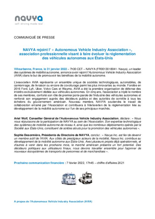 Navya, un leader des systèmes de mobilité autonome, annonce avoir rejoint l’Autonomous Vehicle Industry Association (AVIA) dans le but de promouvoir les bénéfices de la mobilité autonome.