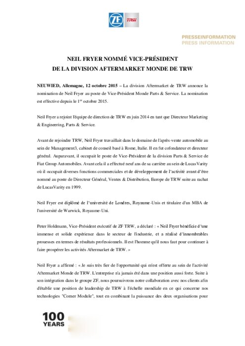 La division Aftermarket de TRW annonce la nomination de Neil Fryer au poste de Vice-Président Monde Parts & Service. La nomination est effective depuis le 1er octobre 2015. Neil Fryer a rejoint l'équipe de direction de TRW en juin 2014 en tant que Directeur Marketing & Engineering, Parts & Service.