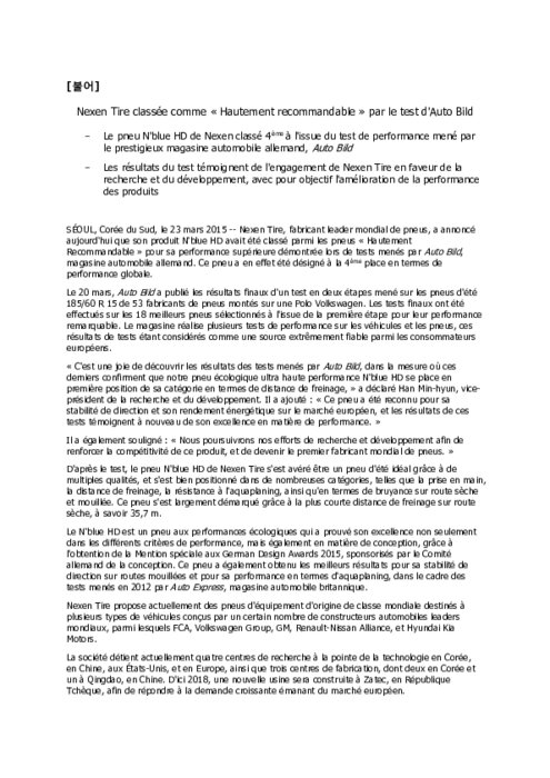 Nexen Tire, fabricant leader mondial de pneus, a annoncé aujourd'hui que son produit N'blue HD avait été classé parmi les pneus « Hautement Recommandable » pour sa performance supérieure démontrée lors de tests menés par Auto Bild , magasine automobile allemand. Ce pneu a en effet été désigné à la 4ème place en termes de performance globale.