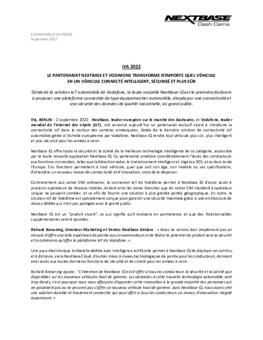 Nextbase, leader européen sur le marché des dashcams, et Vodafone, leader mondial de l'Internet des objets (IoT), ont annoncé aujourd'hui un partenariat exclusif visant à introduire la connectivité IoT dans le secteur des caméras embarquées. Dotée de la dernière solution de connectivité IoT automobile gérée à l'échelle européenne par Vodafone, Nextbase iQ rendra tout véhicule plus sûr, plus intelligent et plus sécurisé pour les années à venir.