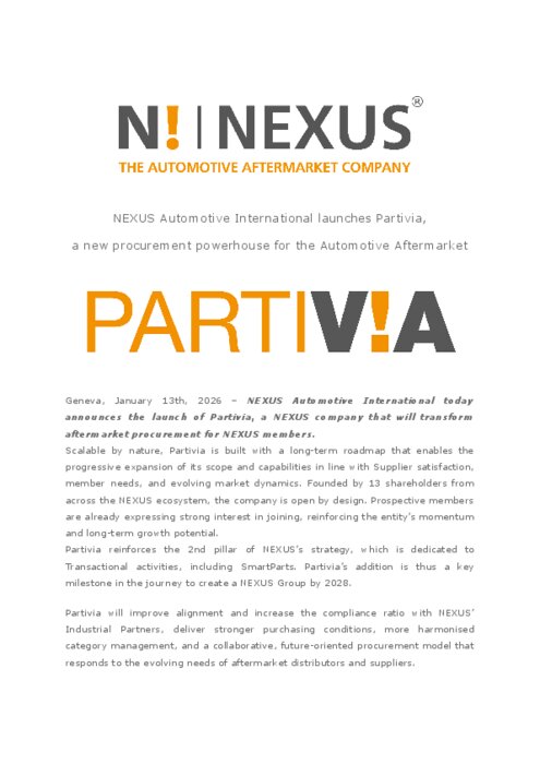 Distributeurs 13 janvier 2026 - 10:30 NEXUS Automotive International annonce le lancement de Partivia, une société du groupe NEXUS qui va transformer l'approvisionnement sur le marché secondaire pour les membres de NEXUS. PDF (4 Mo) Télécharger credit Nexus