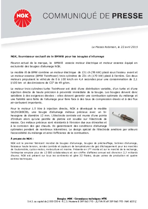 Equipementiers 22 avril 2015 - 12:37 Fleuron actuel de la marque, la BMWi8 associe moteur électrique et moteur essence équipé en exclusivité des bougies d’allumage NGK. PDF (248 Ko) Télécharger