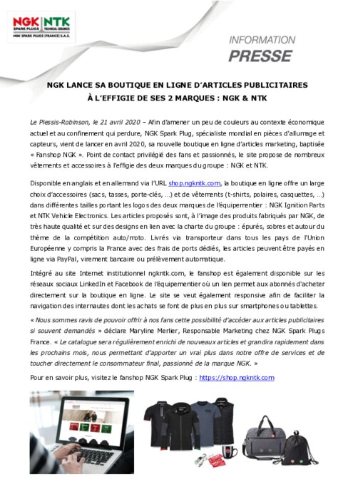 Afin d'amener un peu de couleurs au contexte économique actuel et au confinement qui perdure, NGK Spark Plug, spécialiste mondial en pièces d'allumage et capteurs, vient de lancer en avril 2020, sa nouvelle boutique en ligne d'articles marketing, baptisée " Fanshop NGK ". Point de contact privilégié des fans et passionnés, le site propose de nombreux vêtements et accessoires à l'effigie des deux marques du groupe : NGK et NTK.