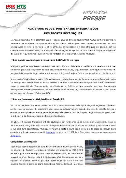 Depuis plus de 50 ans, NGK SPARK PLUGS s'affirme comme le partenaire de confiance de grandes écuries en sports mécaniques. Des courses automobiles les plus prestigieuses comme la Formule 1 et le WRC aux compétitions les plus atypiques en passant par les championnats MotoGP et EWC, cette volonté d'accompagner les sportifs de tous niveaux fait partie intégrante de l'ADN de l'équipementier qui cultive une véritable proximité avec ses ambassadeurs.
