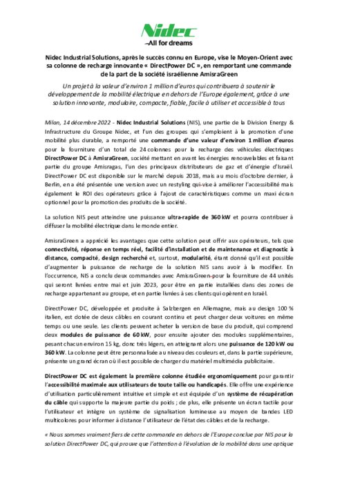 Nidec Industrial Solutions (NIS), une partie de la Division Energy & Infrastructure du Groupe Nidec, et l’un des groupes qui s’emploient à la promotion d’une mobilité plus durable, a remporté une commande d’une valeur d’environ 1 million d’euros pour la fourniture d’un total de 24 colonnes pour la recharge des véhicules électriques DirectPower DC à AmisraGreen, société mettant en avant les énergies renouvelables et faisant partie du groupe Amisragas.