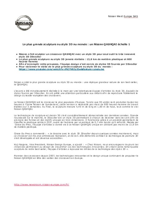 Nissan a créé la plus grande sculpture au stylo 3D au monde : une réplique grandeur nature de son best-seller, le QASHQAI. L’œuvre a été minutieusement réalisée à la main par une talentueuse équipe d’artistes du stylo 3D, équipés de stylos fournis par 3Doodler. Ils ont prêté une attention particulière aux détails afin de reproduire fidèlement le design du leader européen des crossovers.