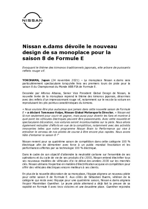 La monoplace Nissan e.dams sera particulièrement spectaculaire lorsqu’elle fera ses premiers tours de piste pour la saison 8 du Championnat du Monde ABB FIA de Formule E. Dessinée par Alfonso Albaisa, Senior Vice President Global Design de Nissan, la nouvelle livrée de la monoplace reprend le thème des kimonos japonais, désormais avec des reflets d’un impressionnant rouge vif, notamment sur le nez de la voiture en reproduisant les plis pointus caractéristiques du kimono.