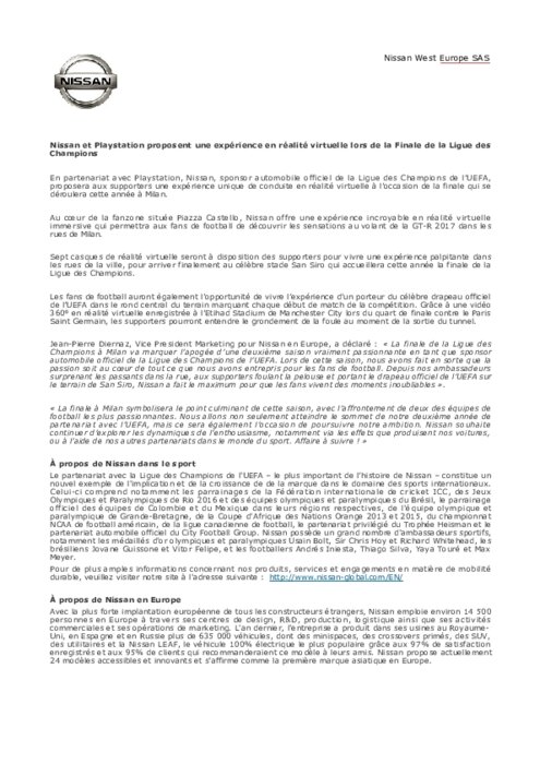 En partenariat avec Playstation, Nissan, sponsor automobile officiel de la Ligue des Champions de l’UEFA, proposera aux supporters une expérience unique de conduite en réalité virtuelle à l’occasion de la finale qui se déroulera cette année à Milan. Au cœur de la fanzone située Piazza Castello, Nissan offre une expérience incroyable en réalité virtuelle immersive qui permettra aux fans de football de découvrir les sensations au volant de la GT-R 2017 dans les rues de Milan.