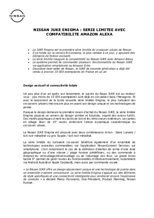 Le JUKE Enigma est la première série limitée du crossover urbain de Nissan. Il se fonde sur la version N-Connecta, la plus vendue à ce jour, y ajoutant des éléments de finition exclusifs. La série limitée inaugure la compatibilité du Nissan JUKE avec Amazon Alexa. Le système permet de commander plusieurs fonctionnalités du Nissan JUKE via application smartphone ou Amazon Echo...