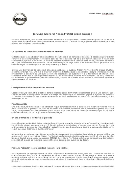 ProPILOT devrait ainsi être introduit prochainement dans d'autres véhicules, dont le Qashqai en Europe en 2017, a précisé le partenaire du français Renault.