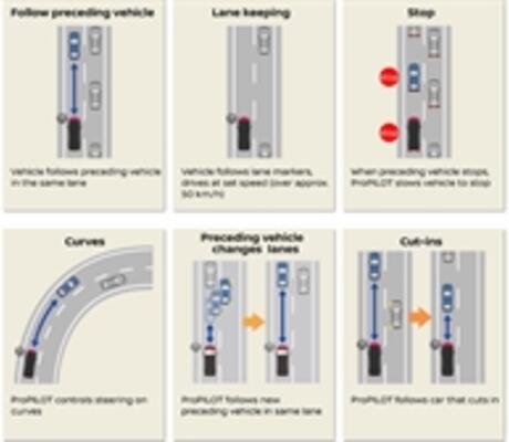 Ce dispositif fonctionne actuellement quand le véhicule reste sur une seule et même voie. La conduite autonome sur les routes urbaines et aux intersections est envisagée pour 2020.