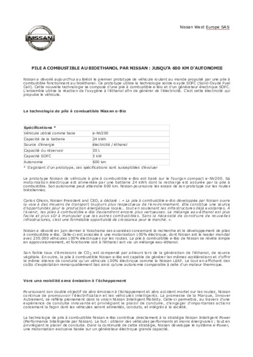 Nissan a dévoilé au Brésil le premier prototype de véhicule roulant au monde propulsé par une pile à combustible fonctionnant au bioéthanol. Ce prototype utilise la technologie solide-oxyde SOFC (Solid-Oxyde Fuel Cell). Cette nouvelle technologie se compose d’une pile à combustible e-Bio et d’un générateur électrique SOFC. L’ensemble utilise la réaction de l’oxygène à l’éthanol afin de générer de l’électricité. C’est cette électricité qui propulse le véhicule.