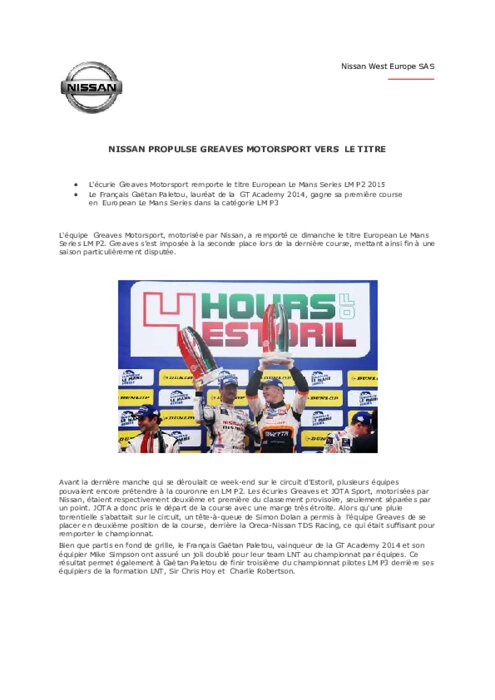L'équipe Greaves Motorsport, motorisée par Nissan, a remporté ce dimanche 18 octobre le titre European Le Mans Series LM P2. Greaves s’est imposée à la seconde place lors de la dernière course, mettant ainsi fin à une saison particulièrement disputée.