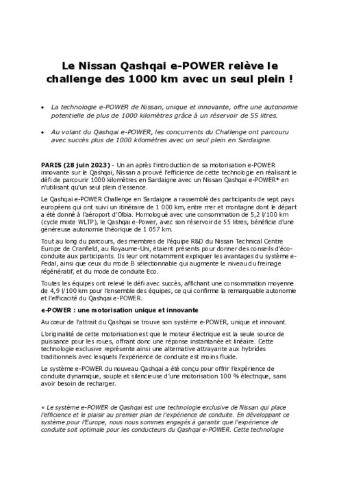 Un an après l'introduction de sa motorisation e-POWER innovante sur le Qashqai, Nissan a prouvé l'efficience de cette technologie en réalisant le défi de parcourir 1000 kilomètres en Sardaigne avec un Nissan Qashqai e-POWER en n'utilisant qu'un seul plein d'essence.