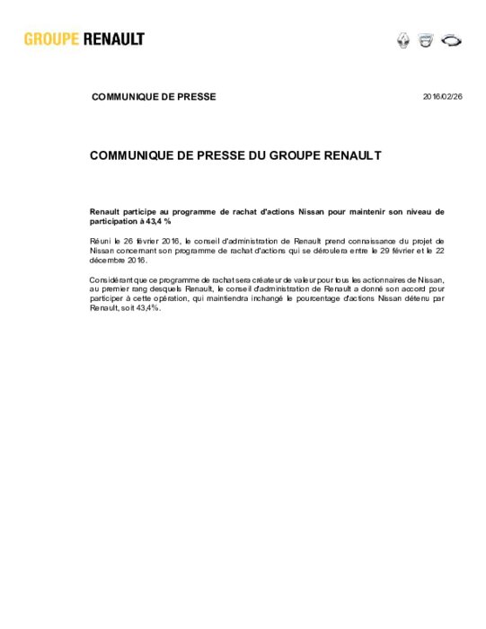 Dans une déclaration distincte, Renault précise en qu'il participera au programme en cédant des titres, afin de maintenir "inchangé le pourcentage d'actions Nissan" qu'il détient, soit 43,4%. Le groupe japonais contrôle pour sa part 15% du français.