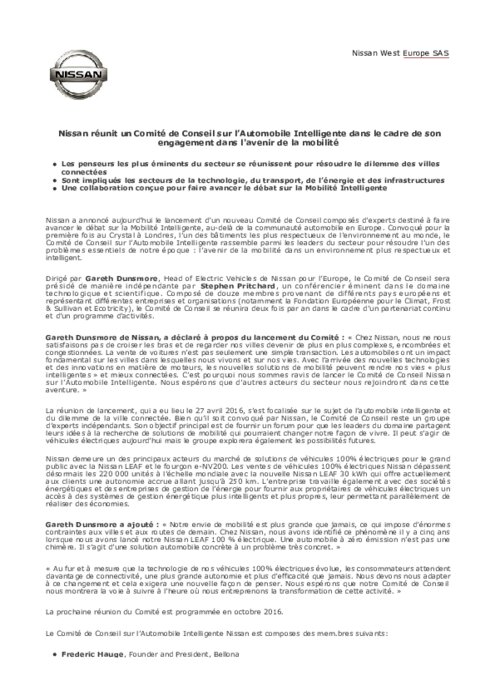 Nissan a annoncé le lancement d’un nouveau Comité de Conseil composés d’experts de la Mobilité Intelligente, au-delà de la communauté automobile en Europe. Convoqué pour la 1ère fois au Crystal à Londres, l’un des bâtiments les plus respectueux de l’environnement au monde, le Comité de Conseil sur l’Automobile Intelligente rassemble les leaders du secteur pour résoudre l’un des problèmes essentiels de notre époque : l’avenir de la mobilité dans un environnement plus respectueux et intelligent.
