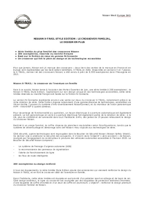 Plus que jamais, Nissan est LA marque des crossovers : deux tiers des ventes de la marque en France et en Europe sont représentées par les best-sellers QASHQAI, X-TRAIL et JUKE. Disponible en versions 5 et 7 places, le X-TRAIL, dernier-né des crossovers Nissan, a été vendu à près de 8.500 exemplaires dans l’Hexagone en 2015.
