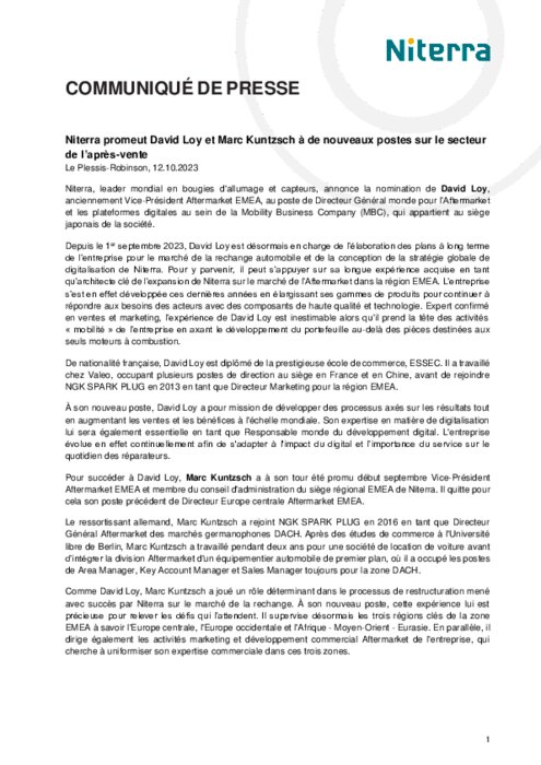 Niterra, leader mondial en bougies d'allumage et capteurs, annonce la nomination de David Loy, anciennement Vice-Président Aftermarket EMEA, au poste de Directeur Général monde pour l’Aftermarket et les plateformes digitales au sein de la Mobility Business Company (MBC), qui appartient au siège japonais de la société.