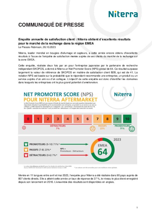 Réalisée deux fois par an pour l'entreprise japonaise par le partenaire de recherche indépendant SKOPOS, cette enquête a en effet donné à Niterra un Net Promoter Score (NPS) global de 64. Ce résultat surpasse largement la valeur de référence de SKOPOS en matière de satisfaction client B2B, qui est de 41.