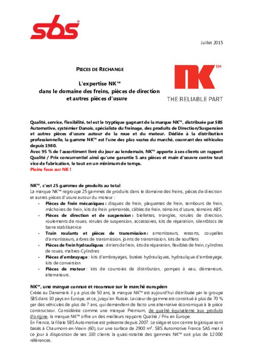 Qualité, service, flexibilité, tel est le tryptique gagnant de la marque NK, distribuée par SBS Automotive, systémier Danois, spécialiste du freinage, des produits de Direction/Suspension et autres pièces d’usure autour de la roue et du moteur. Dédiée à la distribution professionnelle, la gamme NK est l’une des plus vastes du marché, couvrant des véhicules depuis 1980.