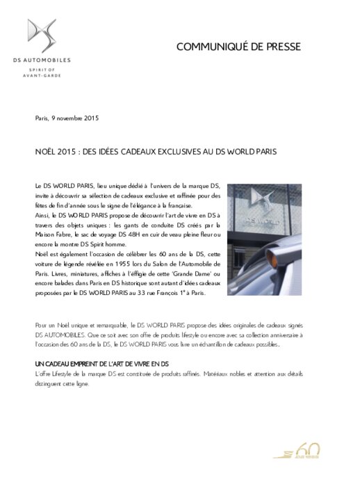 Le DS WORLD PARIS, lieu unique dédié à l’univers de la marque DS, invite à découvrir sa sélection de cadeaux exclusive et raffinée pour des fêtes de fin d’année sous le signe de l’élégance à la française. Ainsi, le DS WORLD PARIS propose de découvrir l’art de vivre en DS à travers des objets uniques : les gants de conduite DS créés par la Maison Fabre, le sac de voyage DS 48H en cuir de veau pleine fleur ou encore la montre DS Spirit homme.