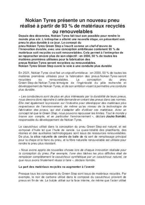 Depuis des décennies, Nokian Tyres fait tout son possible pour rendre le monde plus sûr. L’entreprise a atteint une nouvelle étape, en présentant son pneu le plus durable à ce jour. Le concept du pneu Nokian Tyres Green Step s’inscrit comme un chef-d'œuvre de l’innovation durable, avec une conception ambitieuse contenant 93 % de matériaux soit recyclés ou soit renouvelables.
