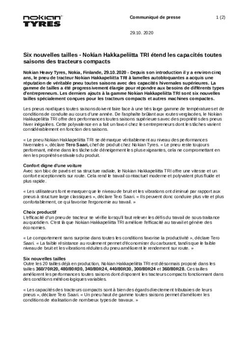 Depuis son arrivée sur le marché il y a environ cinq ans, le pneu de tracteur Nokian Hakkapeliitta TRI à lamelles autobloquantes s’est forgé une réputation pneu toutes saisons de qualité avec des performances hivernales supérieures. La gamme de tailles a été progressivement élargie pour répondre aux besoins des différents types d'utilisateurs. Six nouvelles tailles spécialement conçues pour les tracteurs compacts et autres machines compactes ont été ajoutées à la gamme Nokian Hakkapeliitta TRI.