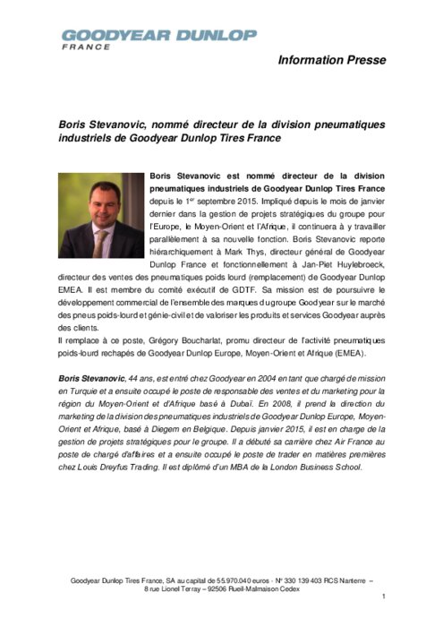 Boris Stevanovic est nommé directeur de la division pneumatiques industriels de Goodyear Dunlop Tires France depuis le 1er septembre 2015. Impliqué depuis le mois de janvier dernier dans la gestion de projets stratégiques du groupe pour l’Europe, le Moyen-Orient et l’Afrique, il continuera à y travailler parallèlement à sa nouvelle fonction. Boris Stevanovic reporte hiérarchiquement à Mark Thys, directeur général de Goodyear Dunlop France.