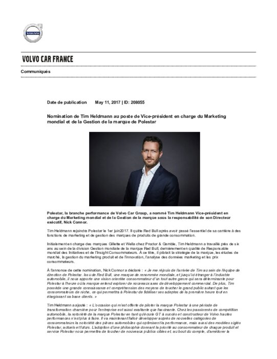 Constructeurs 11 mai 2017 - 11:02 Polestar, la branche performance de Volvo Car Group, a nommé Tim Heldmann Vice-président en charge du Marketing mondial et de la Gestion de la marque sous la responsabilité de son Directeur exécutif, Nick Connor. PDF (118 Ko) Télécharger
