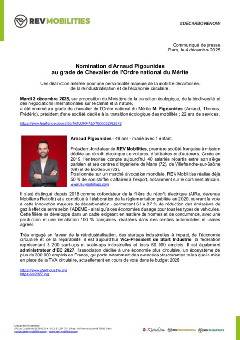 Sur proposition du Ministère de la transition écologique, de la biodiversité et des négociations internationales sur le climat et la nature, a été nommé au grade de chevalier de l’Ordre national du Mérite M. Pigounides (Arnaud, Thomas, Frédéric), président d'une société dédiée à la transition écologique des mobilités ; 22 ans de services.