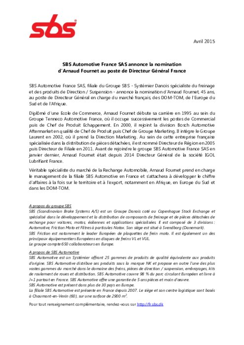 SBS Automotive France SAS, filiale du Groupe SBS - Systémier Danois spécialiste du freinage et des produits de Direction / Suspension - annonce la nomination d’Arnaud Fournet, 45 ans, au poste de Directeur Général en charge du marché français, des DOM-TOM, de l’Europe du Sud et de l’Afrique.