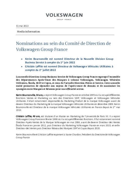 Nominations au sein du Comité de Direction de Volkswagen Group France