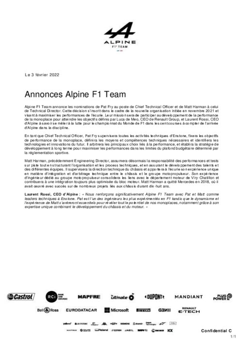 Alpine F1 Team annonce les nominations de Pat Fry au poste de Chief Technical Officer et de Matt Harman à celui de Technical Director. Cette décision s’inscrit dans le cadre de la nouvelle organisation initiée en novembre 2021 et visant à maximiser les performances de l’écurie. Leur mission sera de participer au développement de la performance de la monoplace pour atteindre les objectifs définis par Luca de Meo, CEO de Renault Group, et Laurent Rossi, CEO d'Alpine.