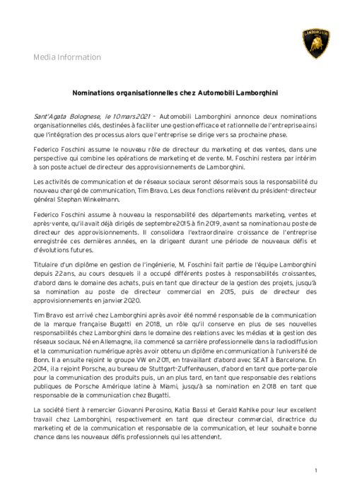 Constructeurs 11 mars 2021 - 16:06 Automobili Lamborghini annonce deux nominations organisationnelles clés, destinées à faciliter une gestion efficace et rationnelle de l'entreprise ainsi que l'intégration des processus alors que l'entreprise se dirige vers sa prochaine phase. PDF (320 Ko) Télécharger