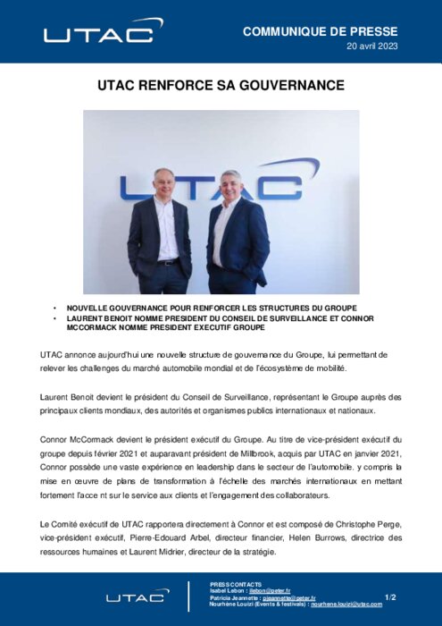Laurent Benoit devient le président du Conseil de Surveillance, représentant le Groupe auprès des principaux clients mondiaux, des autorités et organismes publics internationaux et nationaux et Connor McCormack devient le président exécutif du Groupe.