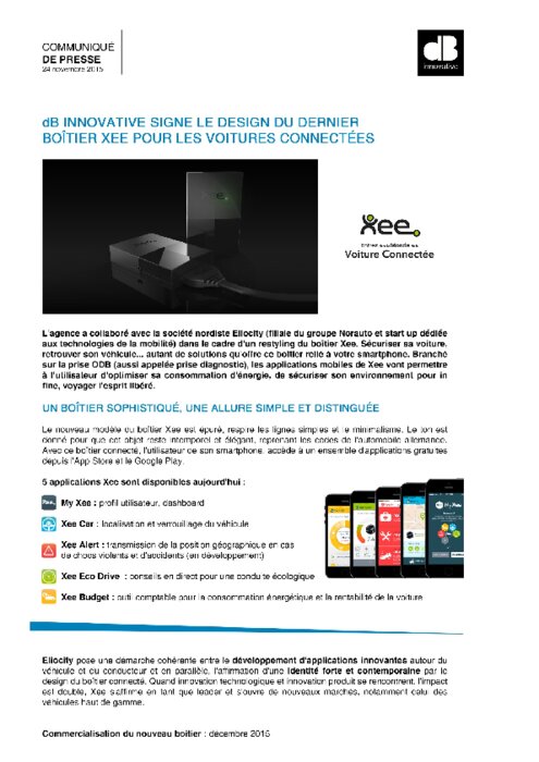 L'agence a collaboré avec la société nordiste Eliocity (filiale du groupe Norauto et start up dédiée aux technologies de la mobilité) dans le cadre d'un restyling du boîtier Xee. Sécuriser sa voiture, retrouver son véhicule... autant de solutions qu'offre ce boîtier relié à votre smartphone. Branché sur la prise ODB (aussi appelée prise diagnostic), les applications mobiles de Xee vont permettre à l'utilisateur d'optimiser sa consommation d'énergie, de sécuriser son environnement.