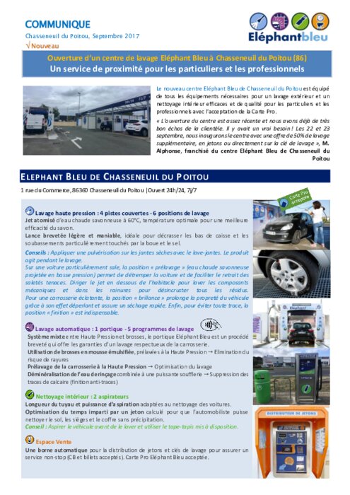 Le nouveau centre Eléphant Bleu de Chasseneuil du Poitou est équipé de tous les équipements nécessaires pour un lavage extérieur et un nettoyage intérieur efficaces et de qualité pour les particuliers et les professionnels avec l'acceptation de la Carte Pro.