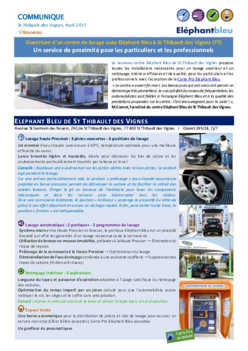 Le nouveau centre Eléphant Bleu de St Thibault des Vignes propose toutes les installations nécessaires pour un lavage extérieur et un nettoyage intérieur efficaces et de qualité, pour les particuliers et les professionnels avec l’acception de la Carte Pro Eléphant Bleu.
