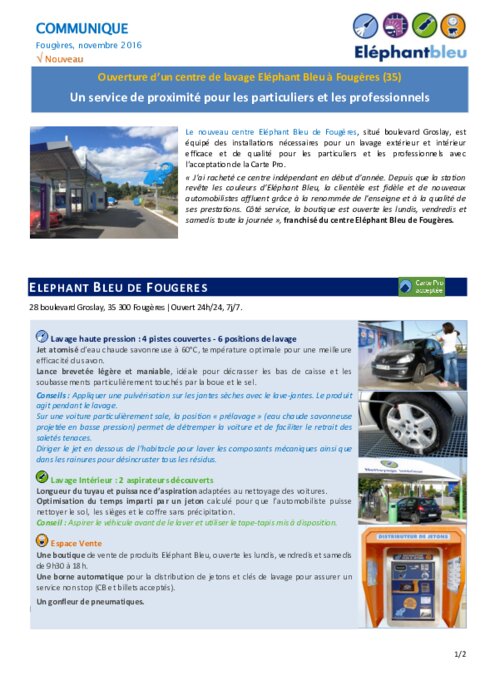 Le nouveau centre Eléphant Bleu de Fougères, situé boulevard Groslay, est équipé des installations nécessaires pour un lavage extérieur et intérieur efficace et de qualité pour les particuliers et les professionnels avec l’acceptation de la Carte Pro. « J’ai racheté ce centre indépendant en début d’année. Depuis que la station revête les couleurs d’Eléphant Bleu, la clientfle est fidèle et de nouveaux automobilistes affluent grâce à la renommée de l’enseigne et à la qualité de ses prestations.