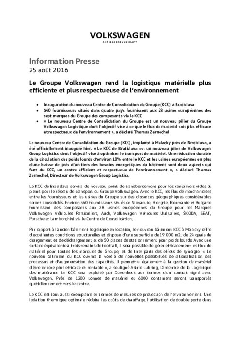 Le nouveau Centre de Consolidation du Groupe (KCC), implanté à Malacky près de Bratislava, a été officiellement inauguré hier. « Le KCC de Bratislava est un nouveau pilier de Volkswagen Group Logistics dont l'objectif vise à optimiser le transport de matériel. Une réduction durable de la circulation des poids lourds d'environ 10% entre le KCC et les usines européennes en plus d’une baisse de près d’un tiers des besoins énergétiques du bâtiment sont deux aspects qui font du KCC, un centre efficie